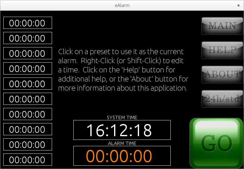 ealarm is a basic alarm clock program. This is a re-write of my old python/PyGame version using C++ and SDL2. I believe it requires hardware rendering capabilities; I can probably improve this version so that it does software rendering as well if anyone wants me to.